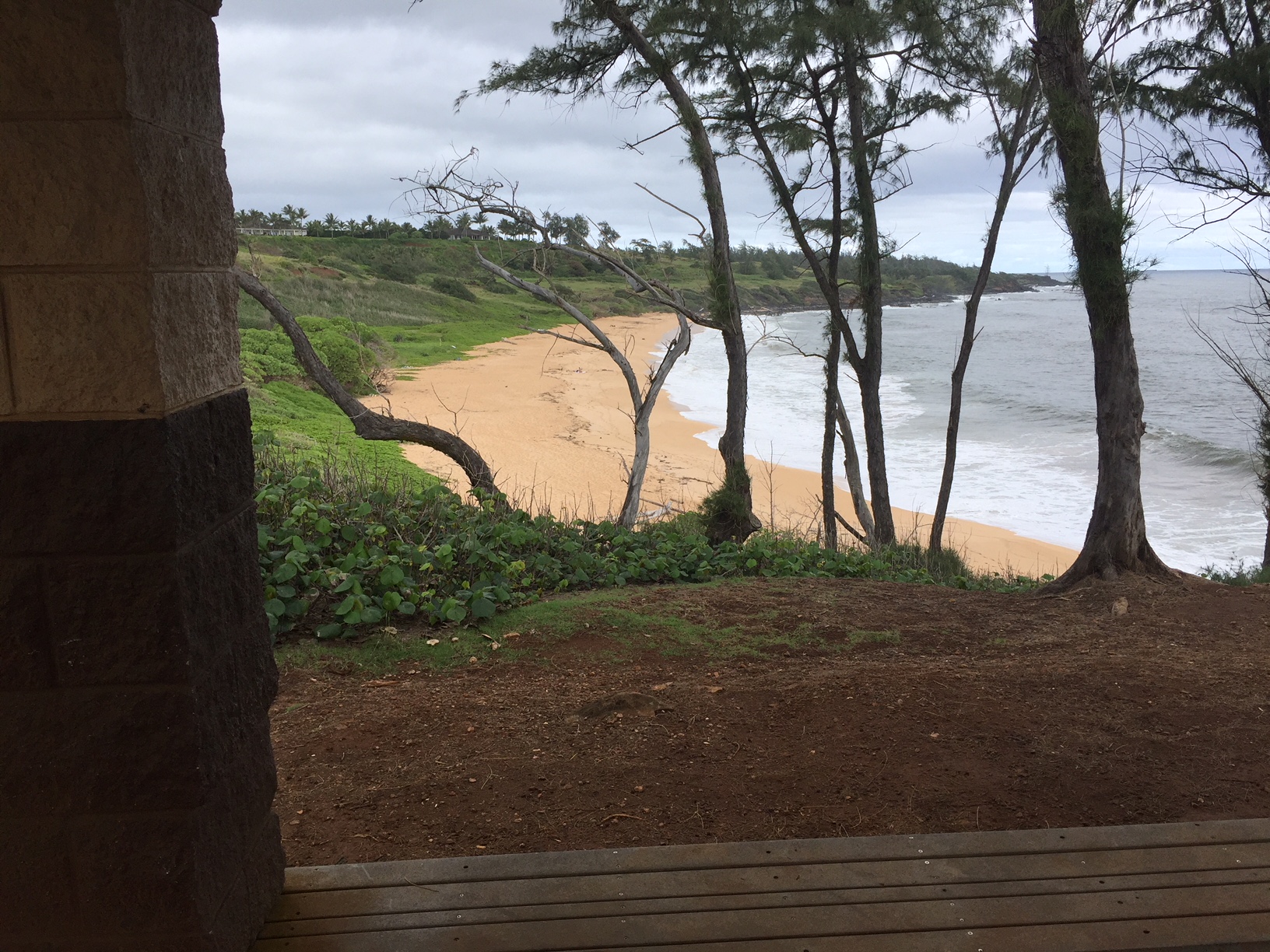 Each day, I’ve gone for long walks. There’s a popular beach called Kealia, with a parking area just a few miles to the north, and if you start there you can walk quite a distance along a cliffside trail, with the waves crashing onto the rocks just below. You just need to be on alert for bikes coming up on you from behind. I like to walk while listening to music, so I don’t hear them coming. Therefore, I stay as far to the right as I can, but they still startle me every now and then. If you walk as far as Donkey Beach, you’ll hit about 8,000 steps by the time you get back to the car. This photo is a view of Donkey Beach, taken from atop the cliff inside a picnic area. It’s a “pretty nice” beach, if by “pretty nice” you mean incredible.
