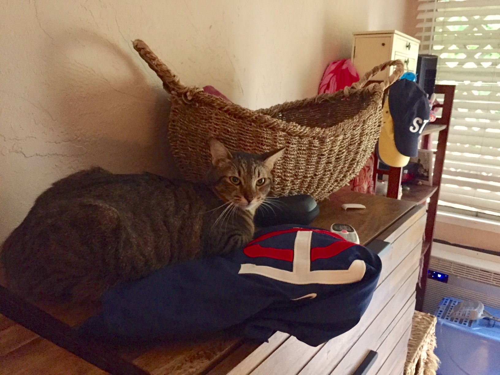 Yesterday, after our pre-dawn petting session, he really relaxed. He was sleeping on my Twins windbreaker later in the day. So, it’s a big deal that he even lets me touch him now, but it’s obvious that he’s still a very skittish kitty. He’s always aware of his escape routes because he doesn’t like to be cornered. I can’t even imagine him letting me pick him up. When I can keep him calm, and rub his nose and ears, he seems to love it, and will knead his front paws instantly.