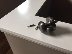 Point No. 2: The two screws that hold the entire exterior handle, interior knob, and the mechanical stuff inside didn’t break, but the receptacles they were screwed into did. I now have a nonfunctioning front door, for the most part. You can put the interior knob back in its place, and it will work when you turn it, but you can’t pull on it because it’s not attached to anything. The whole interior and exterior assembly has to be replaced. I thought that would be easy.