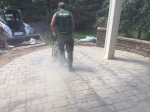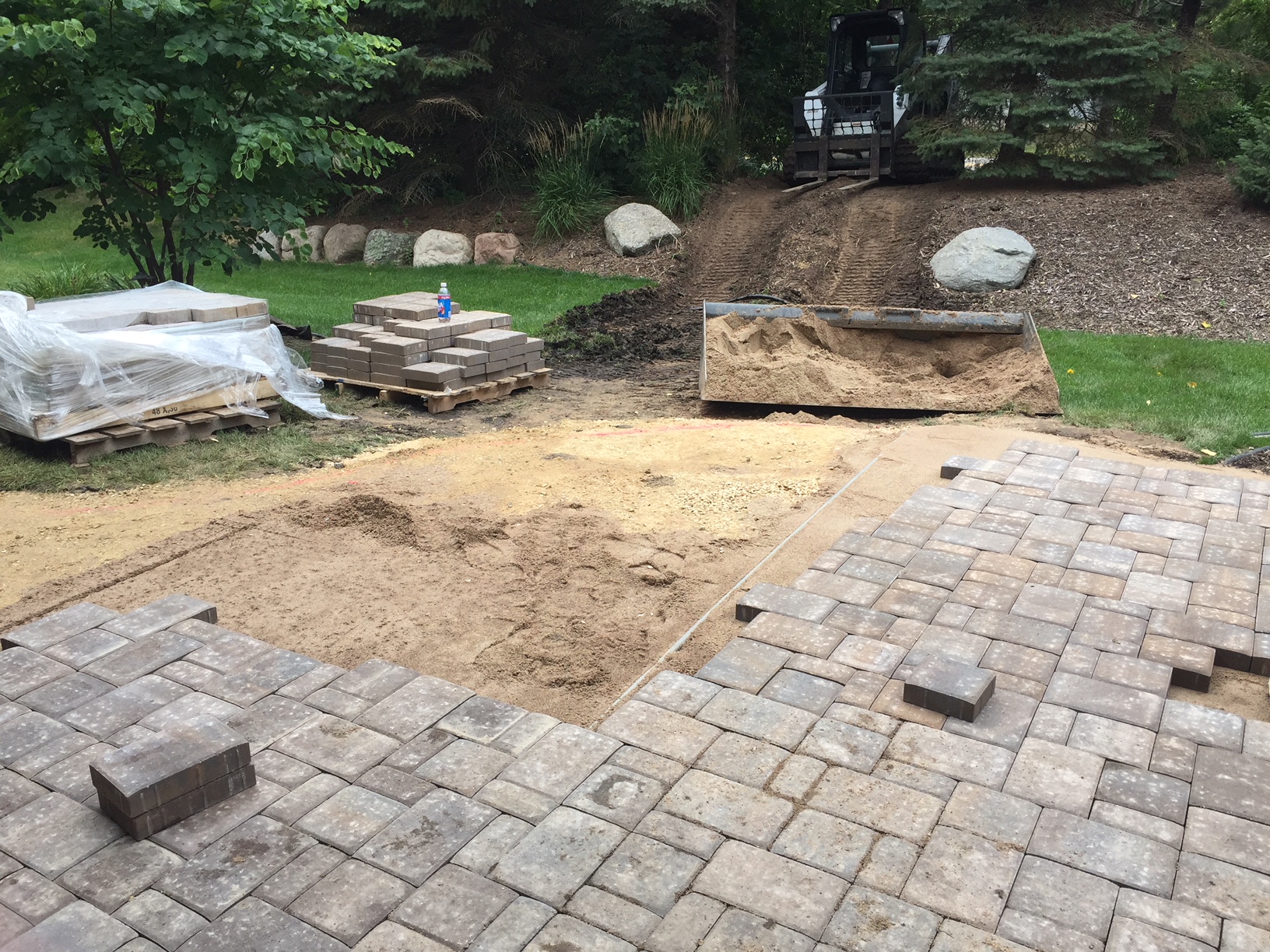 They excavated down about a foot or a foot and a half, and got to work yesterday. First a full coverage of barrier cloth, then aggregate and sand were added, tamped down, and added again until we were back up to grade. They smoothed it all out as if they were icing a cake, and then they got to work putting together the jigsaw puzzle that is a paver patio.