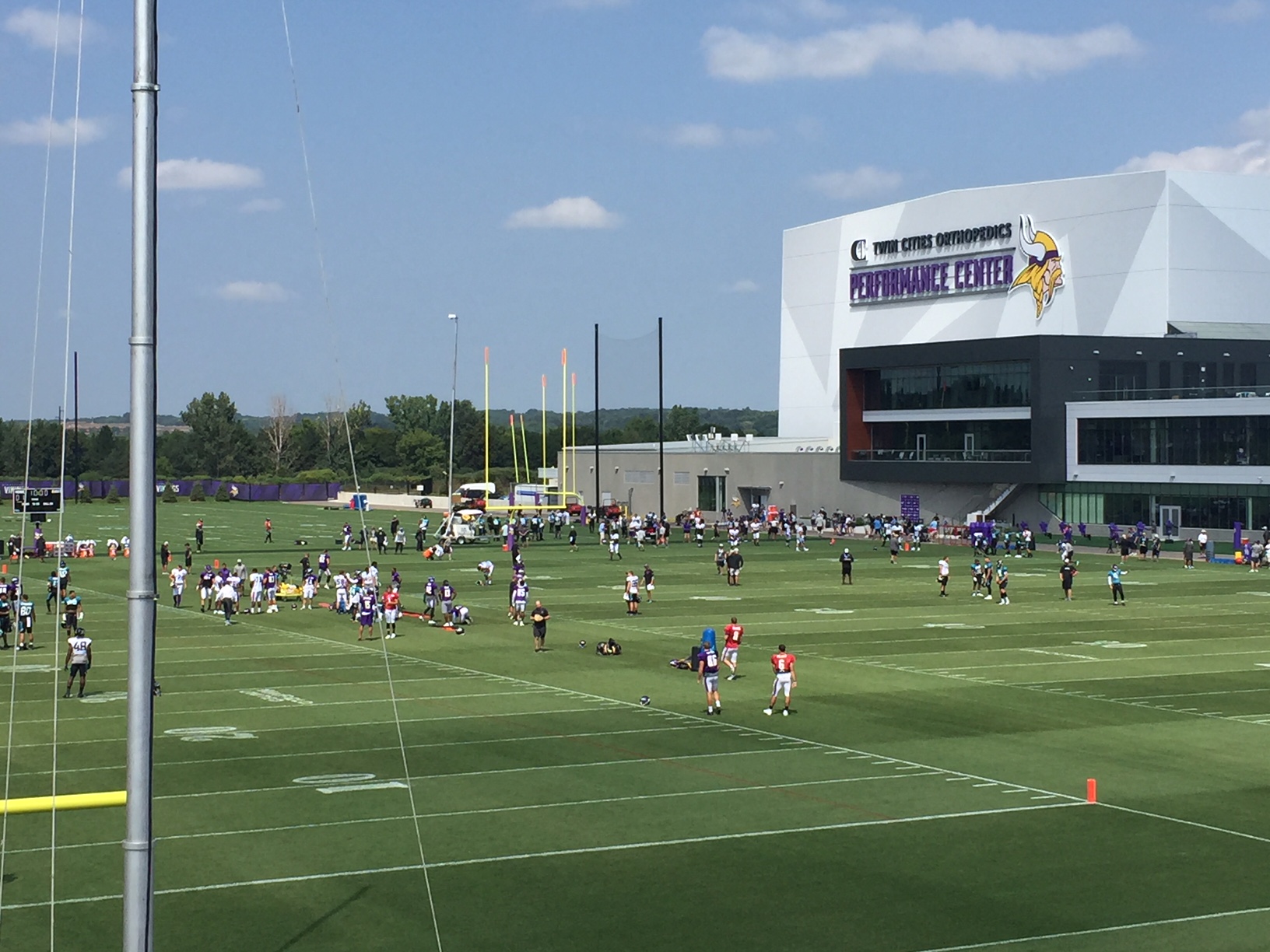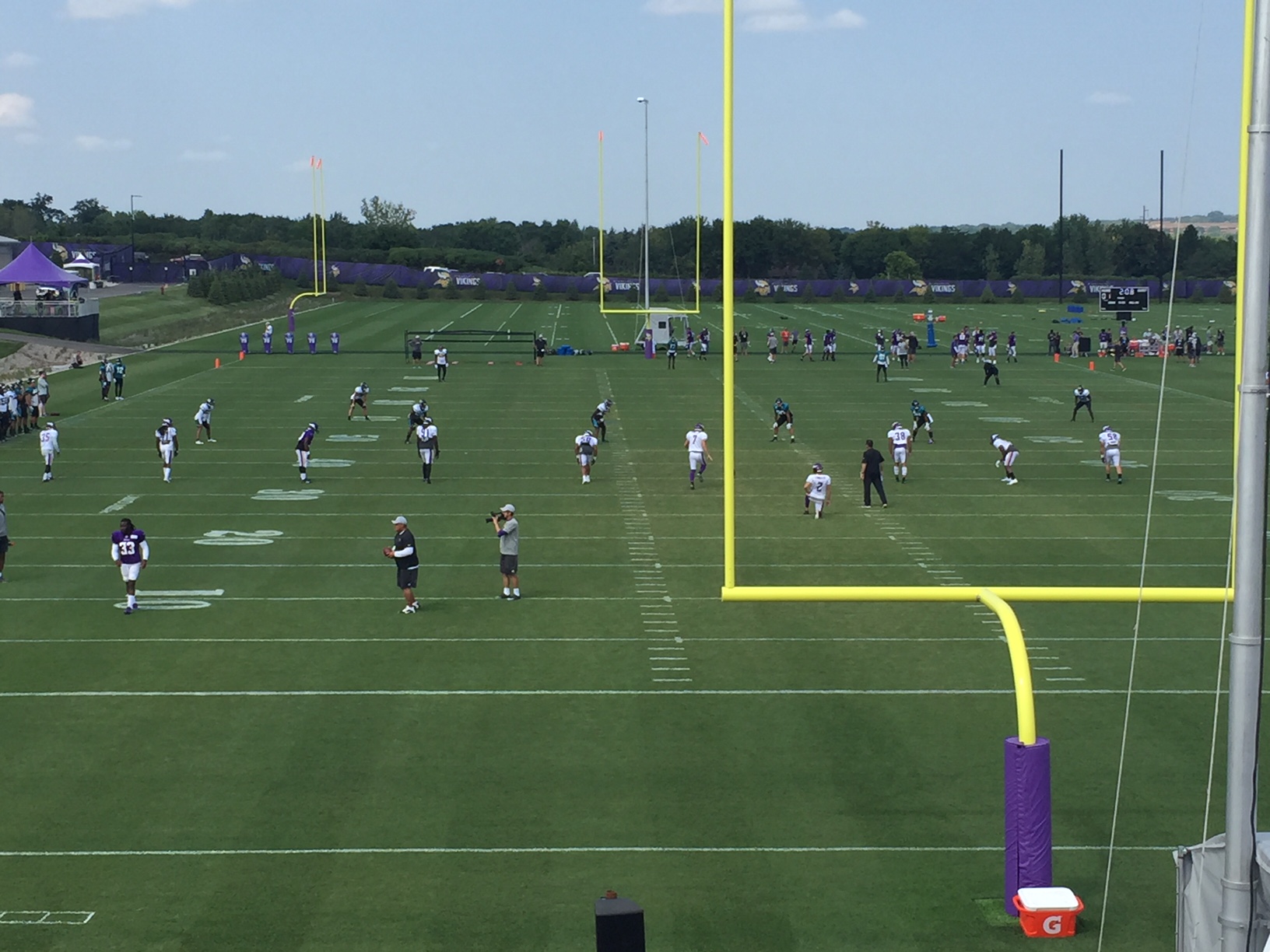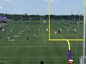 We were there a few hours and at first it was just the Vikings and the Jags doing typical preseason drills on different fields, but after an hour of that both teams split into two groups and faced off for a very controlled scrimmage. The coaching staffs had it orchestrated how they’d work on various phases of the game, so we saw both teams kick off a few times, and then kick field goals and extra points. After that, they lined up to actually run some plays. The linemen were allowed to hit, but there was no tackling involved. It was kind of like a big crunch at the snap followed by touch football, but it gave both teams a chance to do that very thing against someone else instead of against their teammates.
