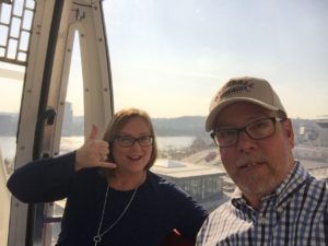 I mentioned briefly last week that I had a ferris wheel story to tell. This is that story. Currently, there’s a big ferris wheel (it tours the country) on the riverfront in Cincinnati. We were downtown on Sunday to find a fun sports bar so Colin could watch his beloved Steelers play the Jaguars, but when we exited the parking garage we saw the ferris wheel and Barbara really wanted to ride on it. The line was short, so we bought tickets and got into one of the pods. It took a while to get to the top, as it usually does on a ferris wheel, because they had to fill the pods five at a time while rotating the big wheel. Finally, when all the new riders were in place (us included) it spun freely and we were surprised it went around four or five times before stopping again. When it did stop, our pod was one spot past the platform where you get off. That seemed odd.
