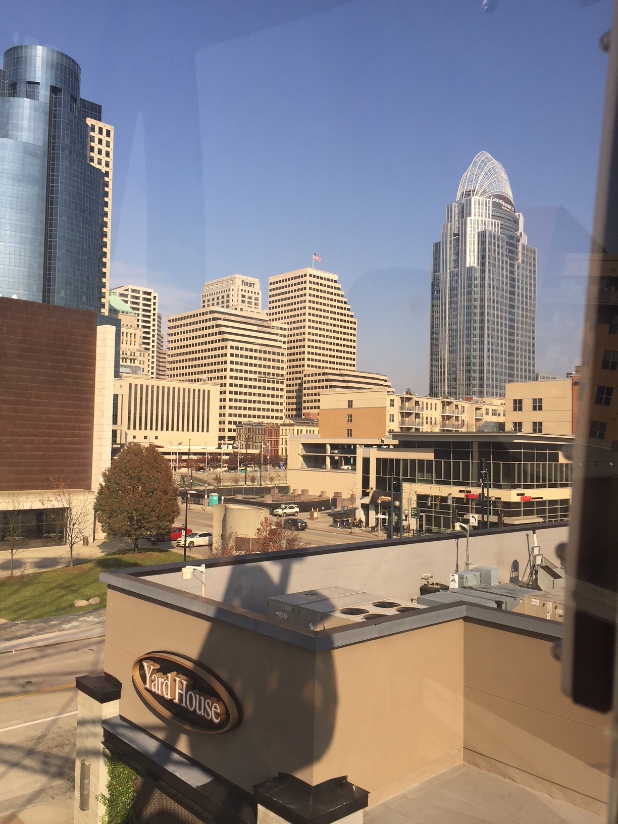 Man, it felt good just to get out of that little bubble and get some fresh air. We walked about a block and were on a street where we had multiple options for having some lunch, enjoying a drink, and watching the game. Colin had been to one of the sports bars before, and it was perfect in every way except the part about it being in Cincinnati while Colin is a lifelong Pittsburgh Steelers fan of the highest order. The Steelers may have been playing Jacksonville, but the Bengals were on most of the TVs and just about everyone in the bar was decked out in their Bengals gear. For the record, the Steelers and Bengals rivalry is on a par with Yankees – Red Sox but if anything maybe a little less civil (if that’s possible). Colin doesn’t back down, though, so he was proudly wearing a Steelers t-shirt that was actually aimed at Bengals fans, while in a rowdy room filled with 100 people wearing tiger stripes. Everyone was friendly, though, so it was all good. And we had a ton of fun. It was great to see Colin and stay with him in his great apartment. So glad we went.