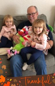 That’s how it was for many hours after we arrived last week, with shy Stassi being the counterpoint to outgoing Bella (short for Arabella) who talks up a storm and laughs at everything. After many hours on our first day down there this time, out of the blue Stassi grabbed her favorite stuffed animal, a little puppy, and walked across the room to hand him to me. It was wonderful. Before long, both the girls were emptying the bin where the stuffed animals live and bringing them all to me, one after another. And then they joined me on my corner of the sofa.