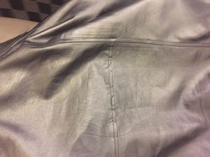 When we got on the plane and I had my jacket on my lap, so that the flight attendant could hang it up, I looked down and saw this faint outline on the back of the jacket. It’s alive! You’ll probably need to click on this photo to actually see the Checker, Schuck’s, Kragen logo, which was very subtle. It was stamped onto the leather rather than stitched. I always liked that they did that because it made the coat sort of an any-occasion jacket, rather than strictly a racing jacket. Now I’m wondering where that other leather jacket ended up.