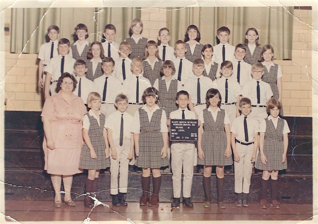 Larry and I went through Mary Queen of Peace for eight years. We were always friends, everyone was friends with Larry, but it was sixth grade when the friendship blossomed from “just two guys cutting up in class” to something very special. The catalyst for that transformation was our teacher, Mrs. Luna. As I wrote about in the book, Mrs. Luna was gregarious, communicative, supportive, brilliant, and she always looked like she should be wearing an apron and stirring spaghetti sauce. She saw something in both Larry and me that forever changed each of us, I think. She saw creativity, outside-the-box thinking, a little bit of mischief, and quite a bit of humor. She paired us up on many projects, including when she decided Larry and I should be the permanent “Decorators of the Classroom.” We ended up in charge of all the themes that were tacked up on the cork above the chalkboards. She even prompted us to do a full-room decoration supporting the Cardinals when they were in the World Series against the Tigers. We nailed it.