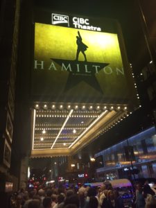 After being surrounded by NFL humanity, we had to get cleaned up and head over to the theater for “Hamilton” so Uber seemed the best way to do that. No need to take showers and then walk six blocks and get all hot again. We got there in plenty of time, found our terrific seats, and got ready for something I was barely ready for.
