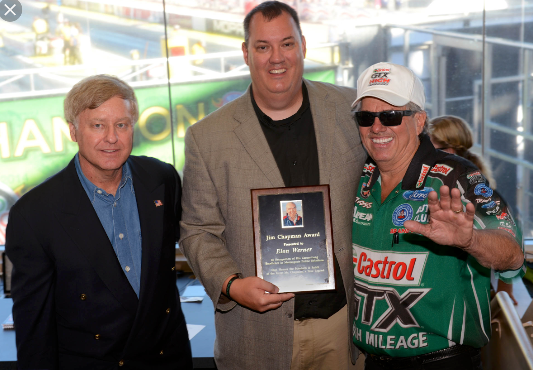 This is Elon (in the middle of course) from a few years back, when he was name the recipient of the Jim Chapman Award. That’s the single most prestigious award a PR person can earn in racing. It basically means you were selected for excellence in PR throughout all of motorsports. You might recognize his boss at the time, on the right, and that’s Michael Knight (who coordinates the selection of the recipient) on the left.