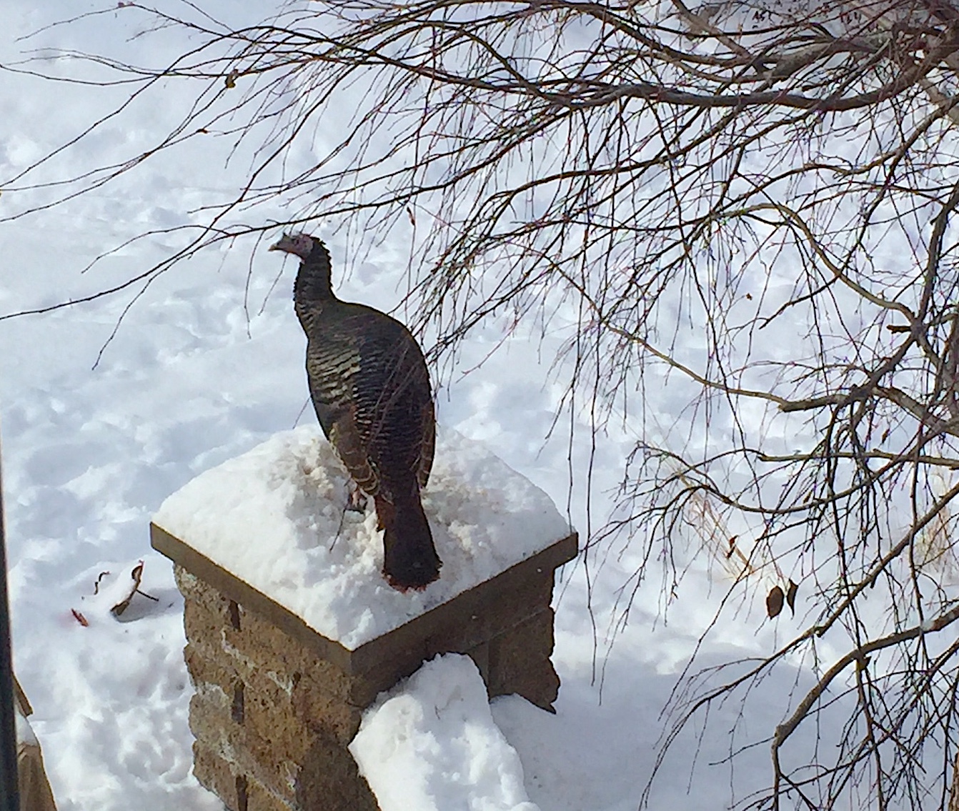 When the snow comes early and heavy, and looks like it’s going to stick around until spring, all of us on our side of the street fill our feeders and even spread some seed around on the ground or wall. Birds gotta eat. So do squirrels. And no, turkeys don’t migrate. If you were ever a fan of the classic sit-com “WKRP In Cincinnati” you will recall the reason why. Think Les Nessman. So, we do what we can to keep everyone fat and happy. Nothing we can do to help her with a makeover to be a little better looking.