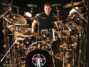 As his drum skills evolved, his “tool kit” evolved right along with that. Over time he added to his kit, whether it be more drums, more cymbals, more bells, or more effects. Before long, he was surrounded by a circle of percussion instruments on stage, all placed on a circular platform that would spin around so that he’d still be facing the audience when he played the backside of the kit.