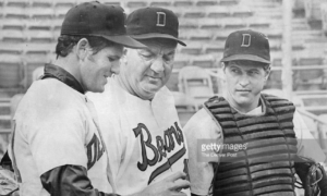 And here’s the next fun thing I found recently. The year is 1971. The location is Mile-High Stadium in Denver. The photo features Denver Bears pitcher Dick Such, manager Del Wilber, and catcher Rick Stelmaszek. I know it’s 1971 because I spent the summers of ’71 and ’72 out in Denver with my dad, as a batboy and general pest. My first year out there, the team wore old-school uniforms. Not sure if they were wool or cotton, but they were the old style from the days before double-knit uniforms became the norm. That’s clearly what they’re wearing in the shot.