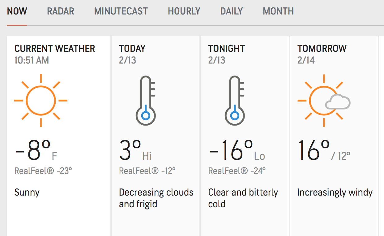 Welcome back, frozen faithful and all you others who are someplace where it’s nice and warm. This might be a bit of a short one today (you’ll understand that when I get to the second part of the “adversity” topic) but we have some ground to cover. Yes, it’s the middle of the afternoon and we haven’t gotten up to zero degrees yet. That’s not really adversity, I guess, but it’s certainly something that has an impact on what you do and where you do it. Tonight, we’ll be back down to -16 or lower again, but we have a rapid warm up scheduled for Friday into the weekend. We may hit 35 on Saturday, and compared to this deep-freeze that will seem balmy. You will, indeed, see Minnesotans running errands in shorts or light jackets.