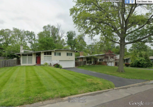 The photo to the right is a brand new one from GoogleEarth. It stunned me to see that “Mary’s Tree” has been chopped down. Yikes! Planted as a stick in 1970 and now nothing but a memory. But the big oak we called the “Green Monster” still dominates. Pitcher’s mound would’ve been about halfway down the drive, with the batter’s box right in front of the garage.