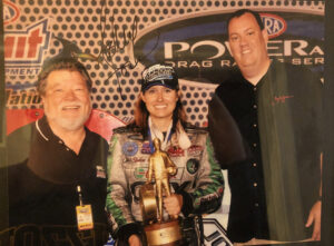 Winner’s circles are always chaotic but we took it to a new level the night Ashley won. We were trying to get her on the phone with reporters in Los Angeles as well a number of other national publications. It was very late on the East Coast so there were deadline issues and as the post-race action progressed Ashley was doing photos for the NHRA, or a sponsor, or I was stepping in to hand her a cell phone with a reporter on the other end of the line asking her what the win meant. Ashley likes structure and schedules and this was the exact opposite of that. At one point I lost my temper with an NHRA marketing rep who wanted to shoot more staged photos while I was trying to get Ashley to talk with an ESPN writer. I told him his “photos can wait but the media can’t” in no uncertain terms on a night of this historic significance. I later went back and apologized for my outburst.